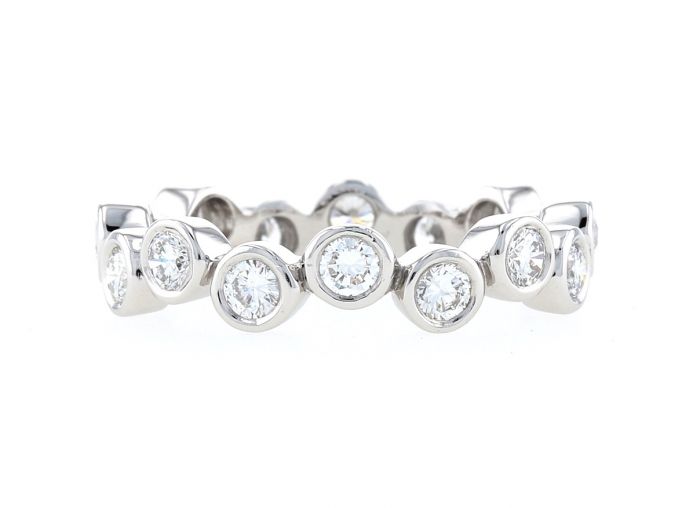 A contemporary platinum eternity band with 1.00ct total weight of diamonds bezel set in a staggered pattern.