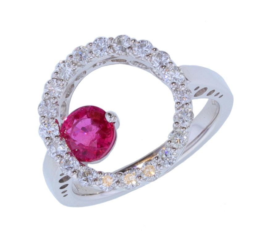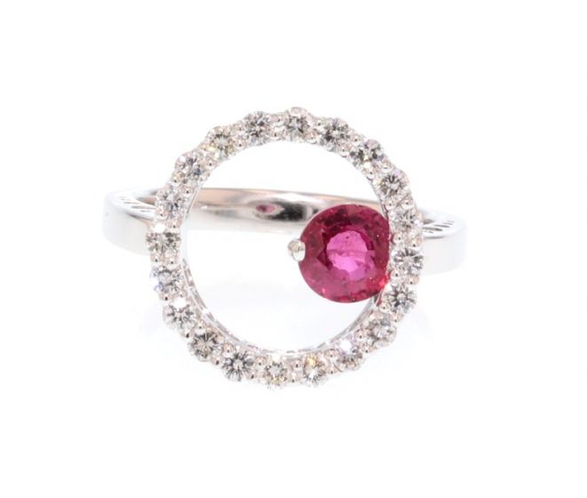 An Original Kristopher Mark Design, this Diamond Circle Ring Highlights a Fiery Red Ruby for a Distinctive Look.