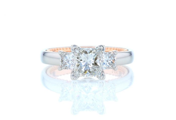 Shown here with a 1.33ct Princess Cut Diamond, this custom Kristopher Mark ring turns the classic "3-Stone" ring into a unique work of art. The rose gold inseam with bead edges and scroll top redefine this classic design.