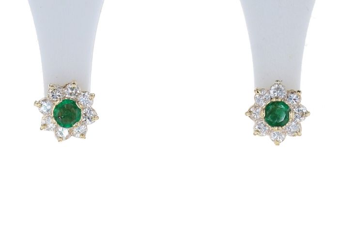 14k Yellow Gold Emerald and Diamond Halo Style Stud Earrings