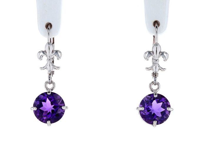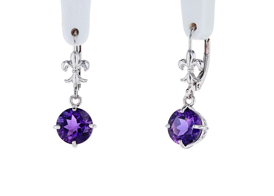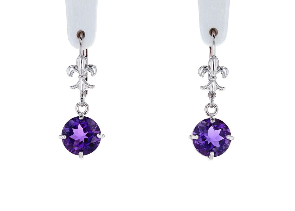 14K White Gold Round Amethyst Scroll Dangle Earrings
