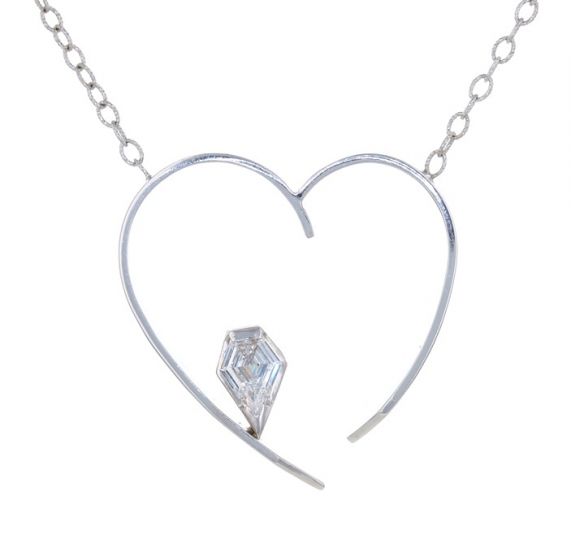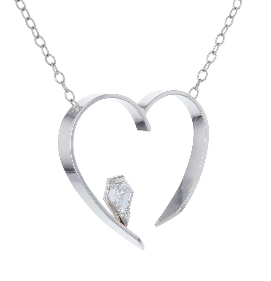 Unique Open heart pendant features a 1/2 Carat Kite Shape Diamond and includes a Faceted Open Cable Link Chain.