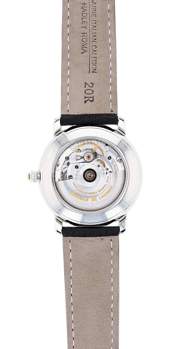Maurice Lacroix Masterpiece Phases De Lune Automatic Watch #37757 in Steel & 18K Gold. Moon-Phase, Day/Date with Skeleton back.
